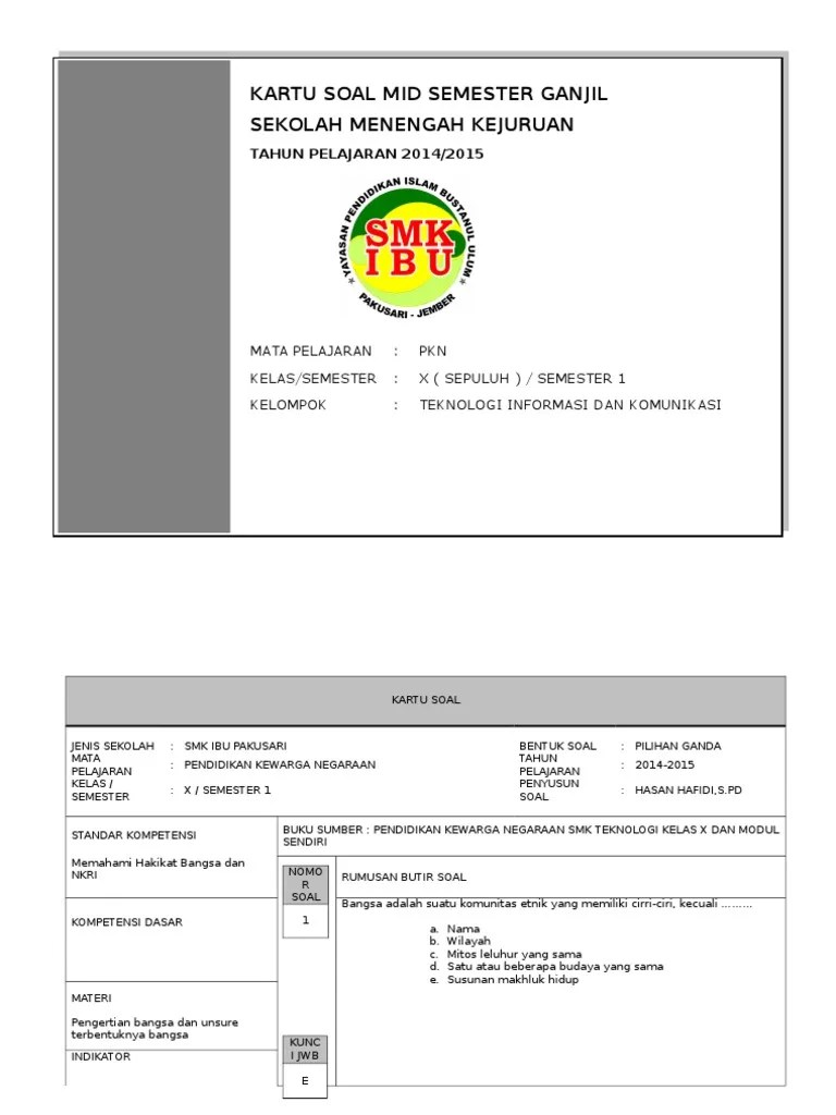Melanjutkan bahan dan pola soal pelajaran pkn kelas x semester dua pilihan ganda dan kunci tanggapan sebelumnya. Mengidentifikasi kewajiban dan hak sebagai anggota . Soal pkn kewarganegaraan untuk kelas x semester 1 dengan kunci jawabannya dalam bentuk pilihan ganda pg pada tulisan ini diharapkan dapat . Latihan soal pkn kelas 10 semester genap. Modul penyusunan soal keterampilan berpikir tingkat tinggi mata pelajaran ppkn.